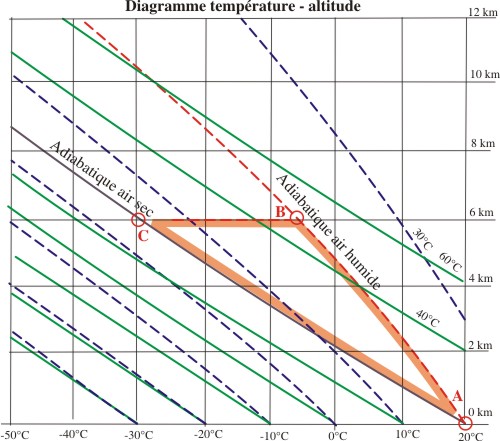 Fig. 9 (Graphique modifié de Wikipedia Commons). Sur le diagramme 9, « altitude, température », de l’air est transporté du sol à 20°C (traits rouges) en suivant une adiabatique. Cet air se condense en cédant la chaleur latente qu’il avait empruntée pour évaporer l’eau à basse altitude. Dans l’exemple (trajet ABCA), l’air se refroidit par transformation thermodynamique et se condense progressivement (AB). Il se refroidit jusqu’à -30°C au contact de l’air environnant à l’altitude de 6 km (trajet BC). Dans la suite de cet exemple, l’air, privé de son humidité par des pluies, redescend suivant l’adiabatique air sec (CA) pour revenir au point de départ. En A, le soleil doit chauffer le sol pour vaporiser l’eau et pour faire repartir le cycle sur l’adiabatique humide. Les adiabatiques humides ont une forme plus courbée dans la zone où la condensation de l’eau est plus importante (partie inférieure droite du diagramme 9).
