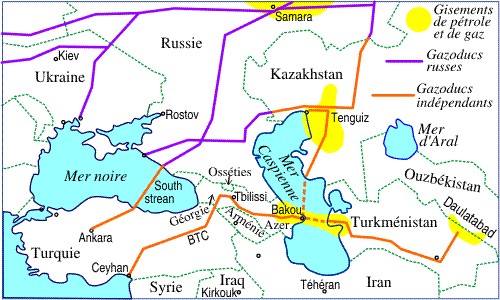 Tant qu'il n'y a pas de désaccords, le pétrole et le gaz naturel circulent librement en Russie et dans le Caucase. Les accords possibles pour faire passer un gazoduc par l'Afghanistan ont été empêchés par des combattants talibans en 1995. Le nouveau président de la Russie, Medvedev, un ancien dirigeant de Gazprom, semble prêt à renforcer le monopole du cartel gazier russe (et iranien) et à s'opposer aux Occidentaux qui essaient d'éviter de passer par la Russie ou l'Iran en construisant des gazoducs pour acheminer le gaz du Kazakhstan, du Turkménistan et de l'Ouzbékistan par des gazoducs sous-marins (en projet) à travers la Caspienne jusqu'à Bakou en Azerbaïdjan et, de là, par la Géorgie et la Turquie, jusqu'au terminal portuaire de Ceyhan sur la Méditerranée. Des projets de gazoducs par les Balkans ou l'Italie peuvent amener à bas prix ce gaz en Europe.